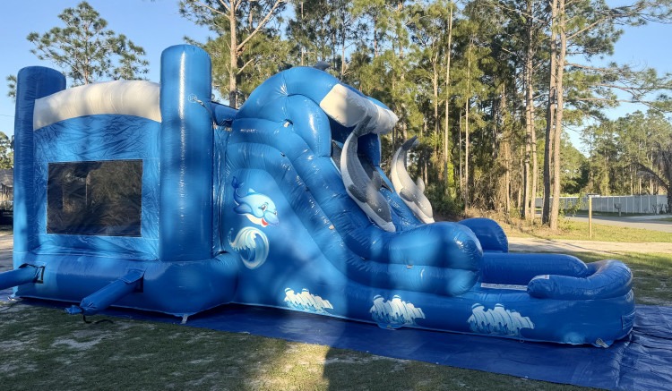 The Dolphin Combo brings together a spacious bounce area and an exciting double-lane slide, ending with a refreshing splash into an inflated pool. It’s the perfect all-in-one setup to keep kids moving and entertained for hours.